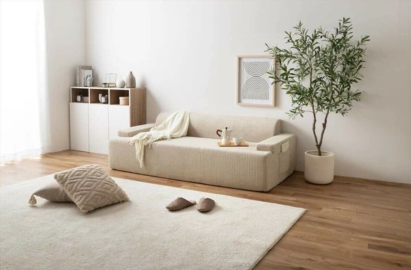 小さく届いて広々使える、快適圧縮シリーズの3人掛けソファ。圧縮梱包でお届けするため、狭い玄関や通路でもスムーズに搬入可能。広げるだけで設置が完了し、工具やネジは不要。力のいる作業もありません。高密度ウレタンをたっぷり使用し、広めの座面としっかりした弾力で、ゆったりくつろげる座り心地を実現しました。両側には小物の収納に便利なポケット付きで、リモコンや雑誌などをさっと片付けできます。