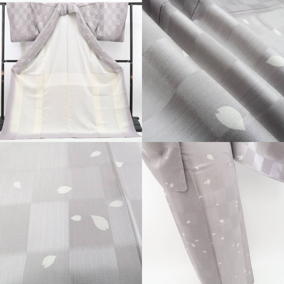 大人びた薄鼠色の地に格子を模るモダン市松の色模様、洒落格子の濃淡に桜散らしが醸し出すこの上ないお洒落感、それはモダンお召の粋な奥行…手くくり手摺り込みによる絣糸を一本一本合わせながら織り上げるお召の味わい、独特のしっとりとした風合いが着物の味わいを一段と馴染みやすい趣に変えています。