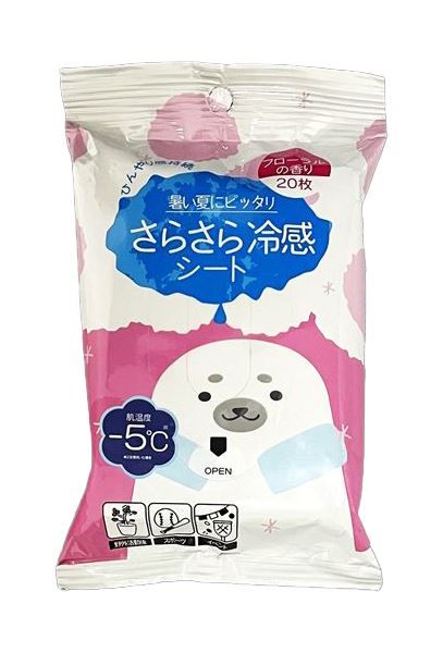さらさら冷感商品は春夏シーズンにはとても需要があります。べたつく汗・ニオイをしっかり拭き取り取れる携帯用サイズとなります。全身拭いた後にスッキリ爽快と肌温度ー5℃でひんやり気持ち。フローラルの香り商品です。
