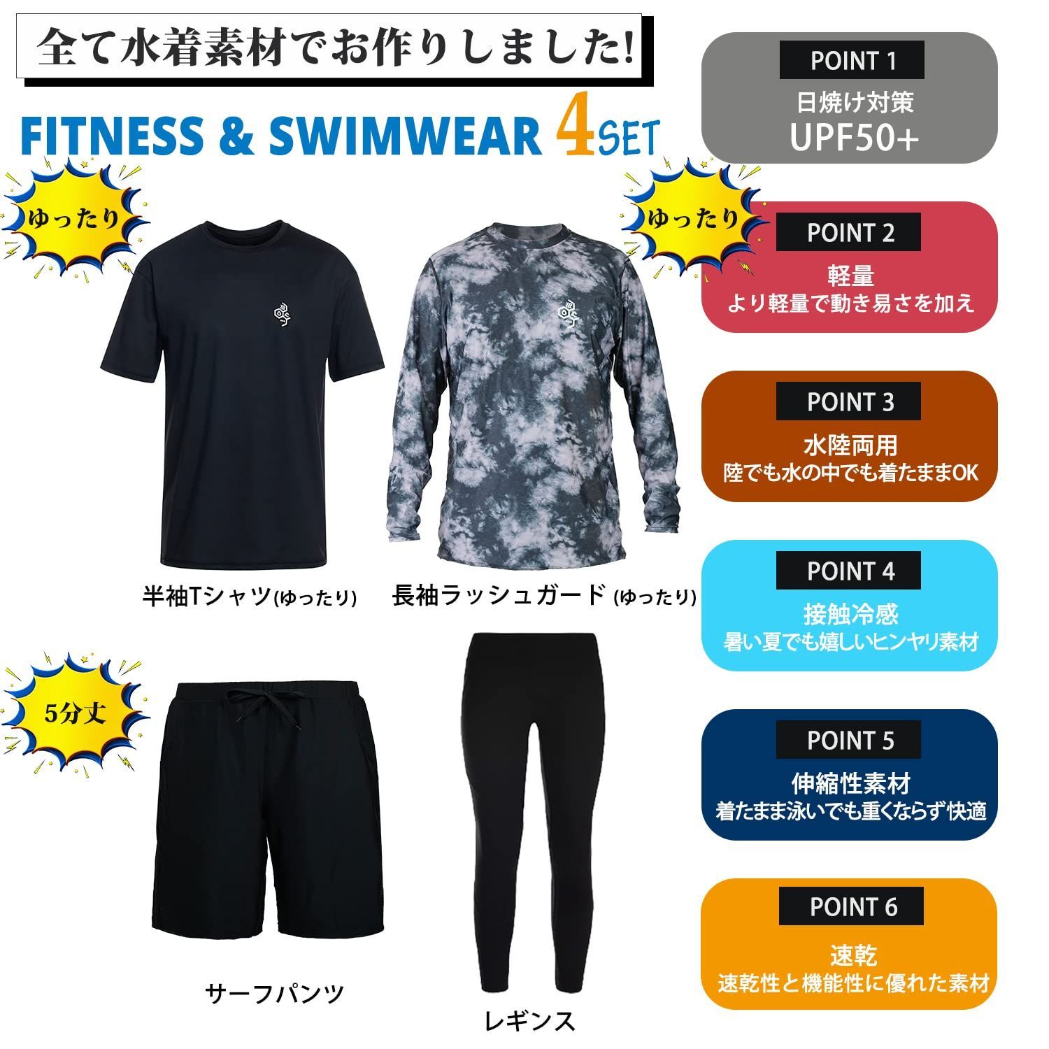 【セット内容】ラッシュガード半袖、ラッシュガード長袖、レギンス、サーフパンツ。