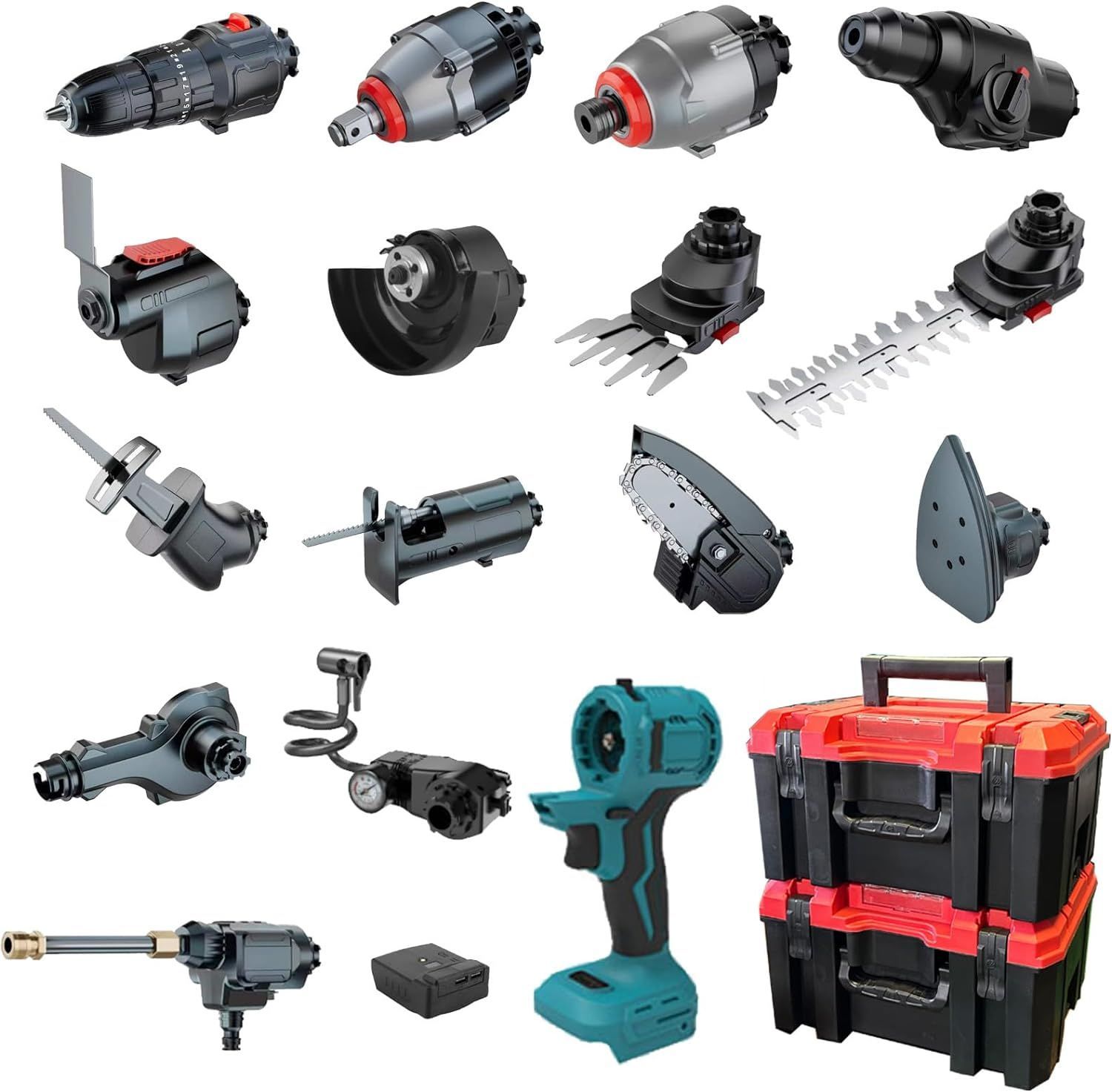 【16種類の工具が使用できるマルチツール】アタッチメントを着脱することでDIY、園芸、アウトドア活動と様々な用途に対応できるマルチツールセット。収納ケース2個に16個のアタッチメントが同梱。