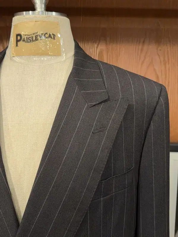 雄大なピークドラペルと高級感あふれるストライプの男性的方向性がずれなく調和したエレガントなモデルです。