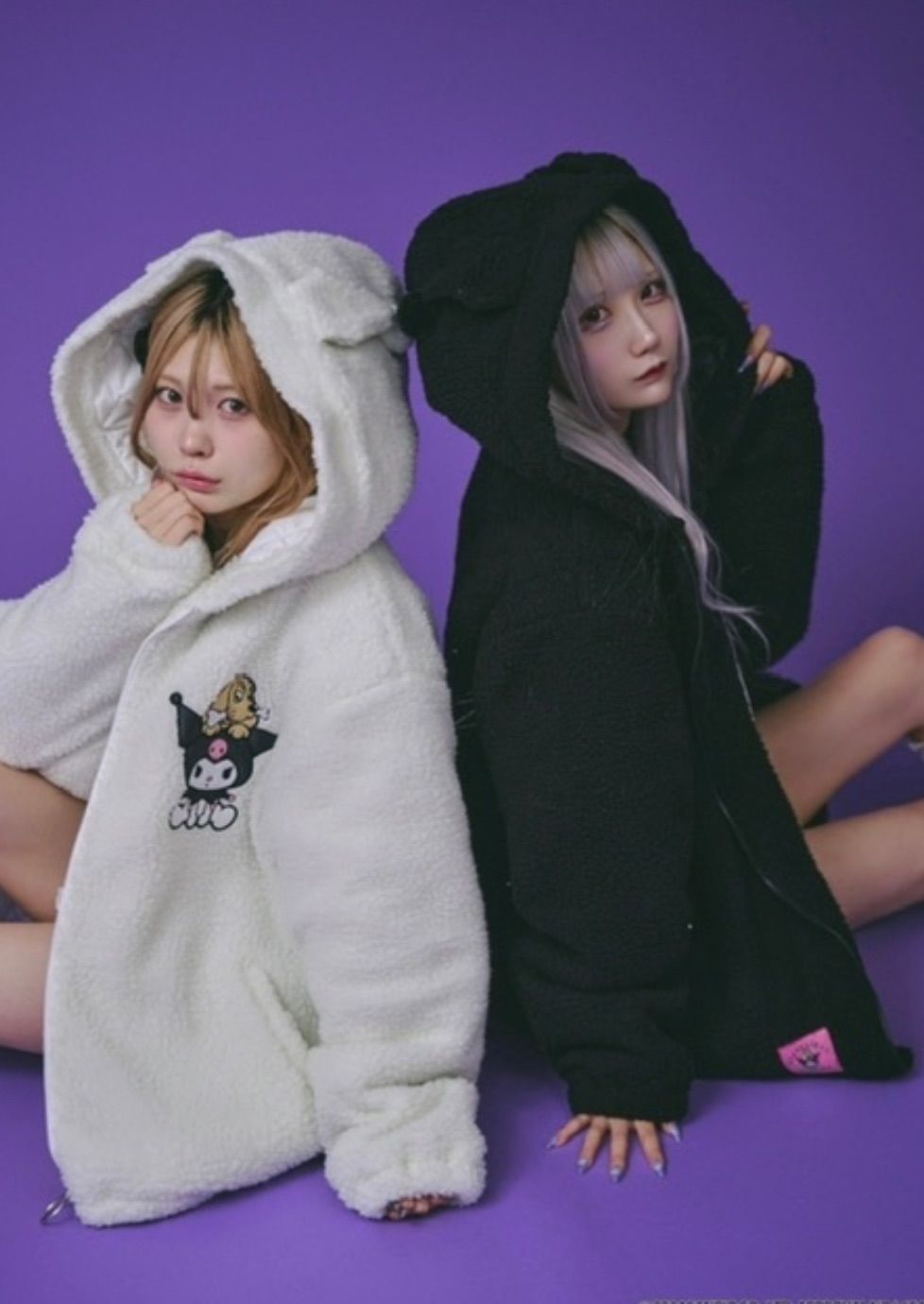 GALFY×KUROMI モコモコ丸ボアずきんパーカー ガルフィー×クロミ ファーロゴ長袖ジップアップパーカー 商品コード