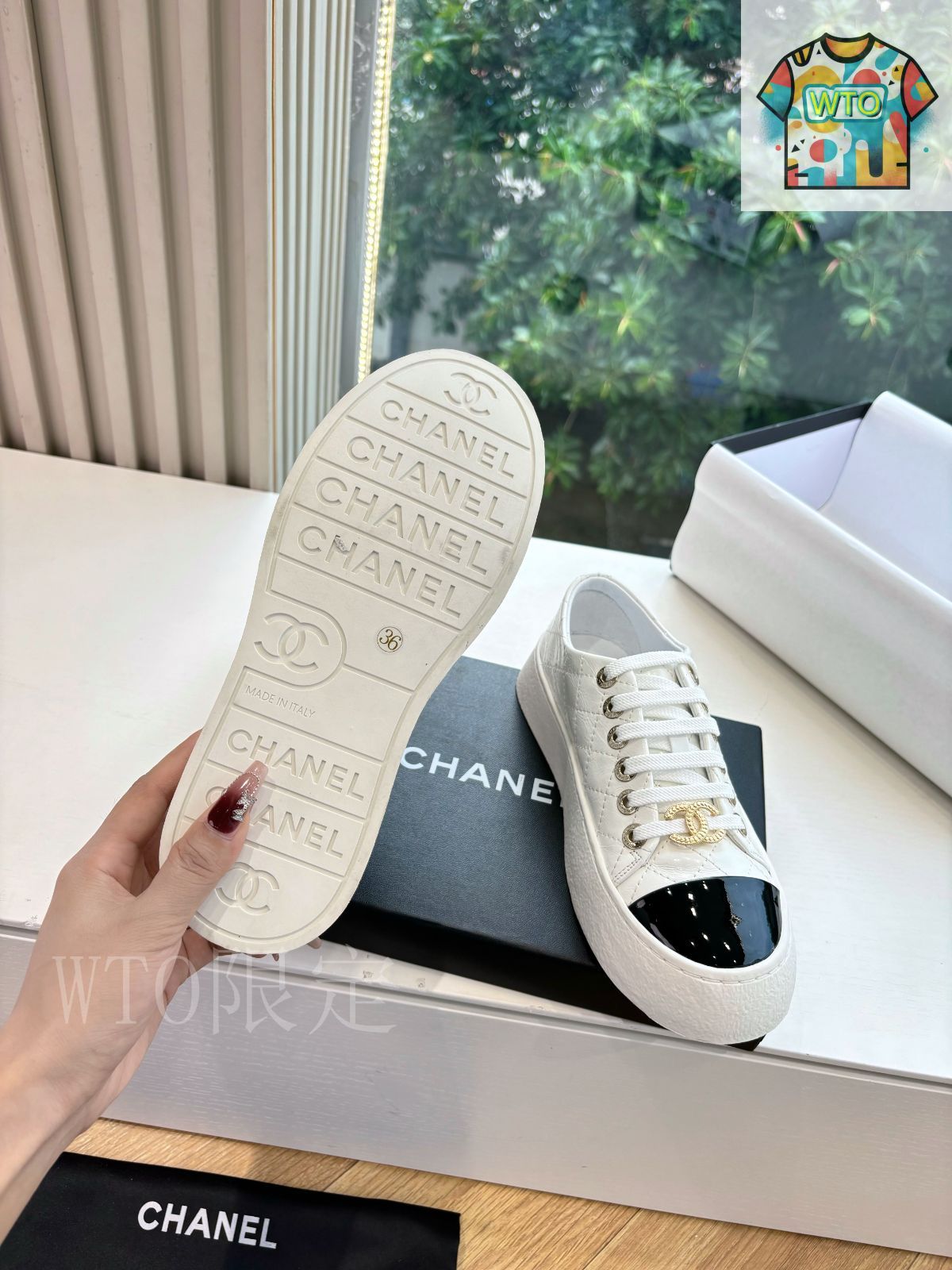 鞋面には光沢感のある漆皮と通気性に優れた布面を組み合わせたデザイン。漆皮部分にはシャネルの象徴的な双 C ロゴをディテールとして配し、高級感とブランドアイデンティティを強調します。