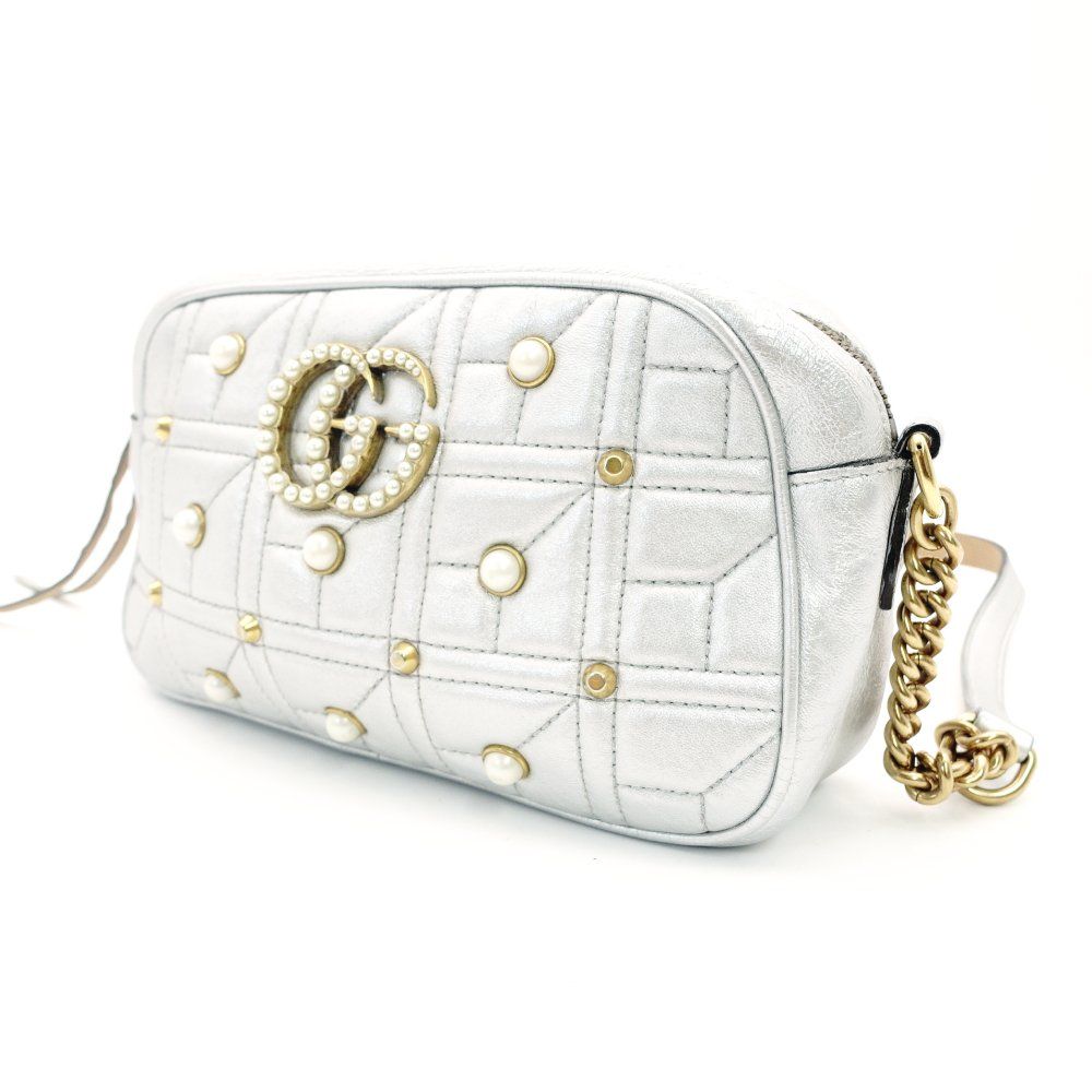 グッチ GUCCI GGマーモント チェーン ショルダーバッグ シルバー レザー パール スタッズ クロスボディ ゴールド金具 7-10-700