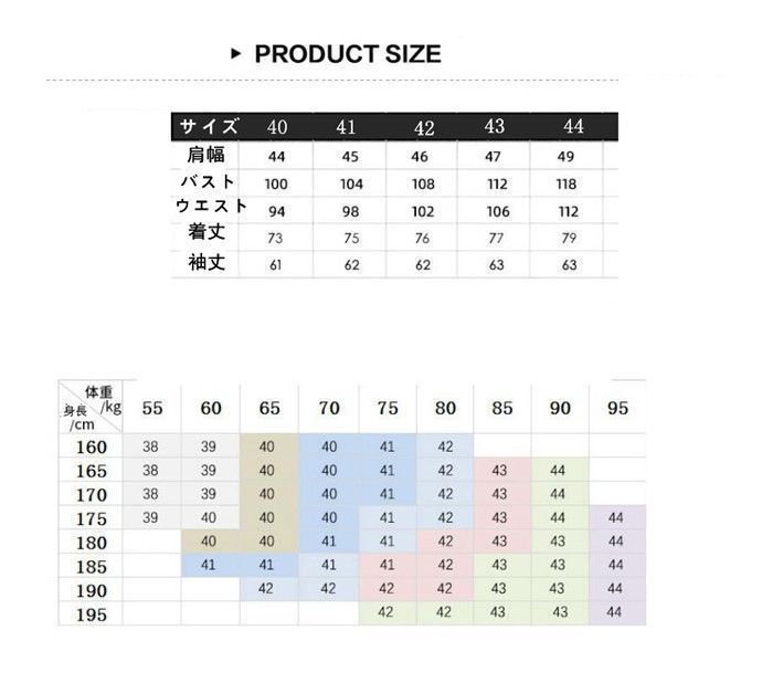 【サイズ】40/L(日本S相当)、41/XL日本M相当)、42/2XL日本L相当)、 43/3XL日本XL相当)、44/4XL日本2XL相当)