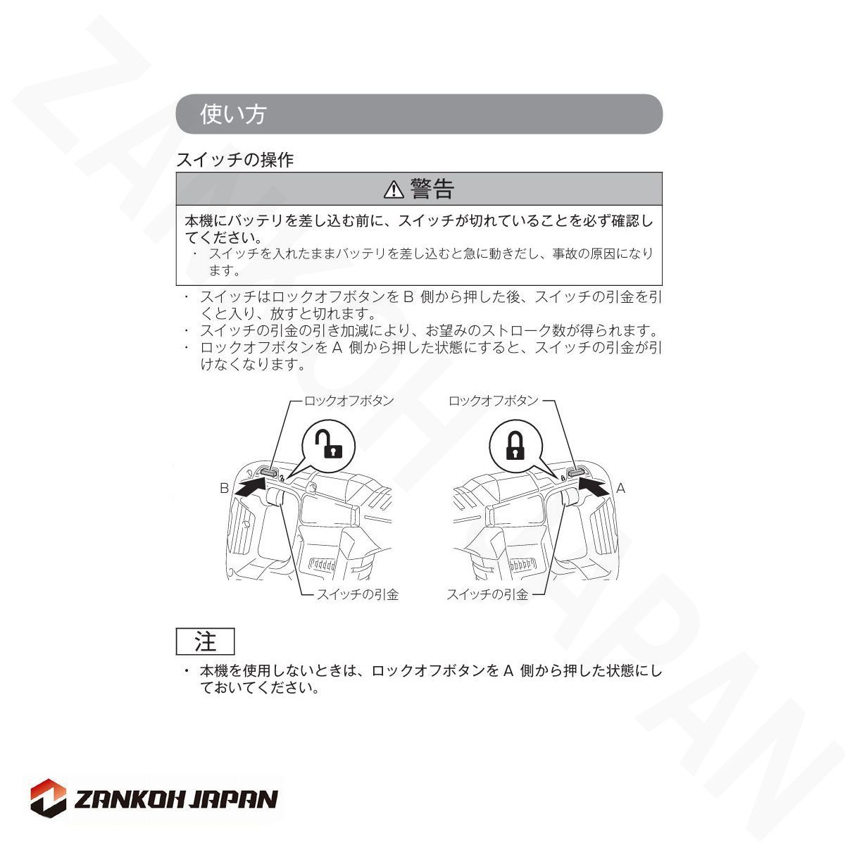 説明書は英語ですが、日本語説明書が必要な場合は日本製JR188DRGの説明書をマキタHPからダウンロード可能です。