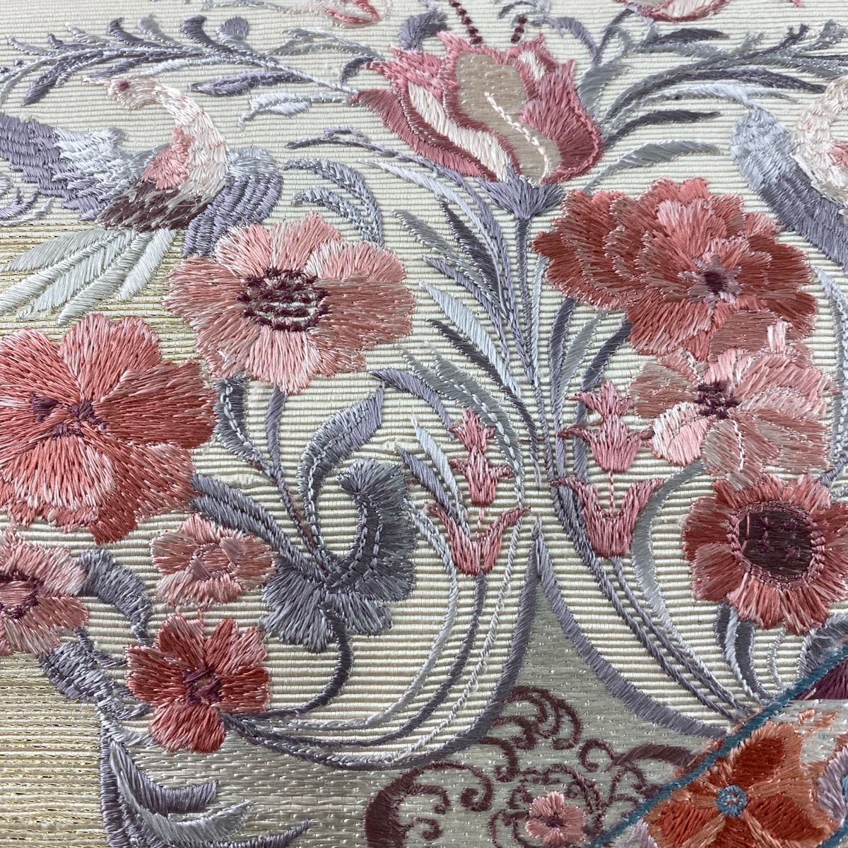 名古屋帯 秀品 八寸名古屋帯 松葉仕立て 草花 鳥 箔 刺繍 クリーム 正絹