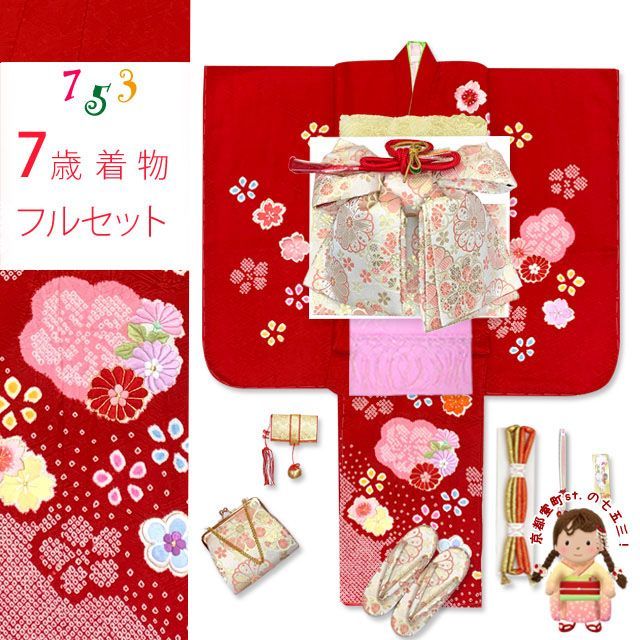 七五三 着物 7歳 フルセット 正絹 女の子 絞り染 刺繍入り 絵羽付けの子供着物 コーディネートフルセット 赤 菊と桜 IYS 1018 i 35 551 KAP