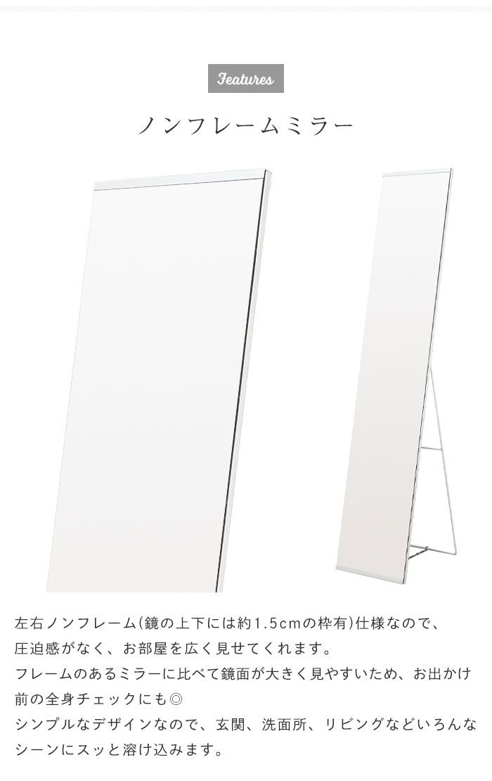 スッキリとした印象で圧迫感がなく、お部屋を広く見せる効果のあるノンフレームスタンドミラー。