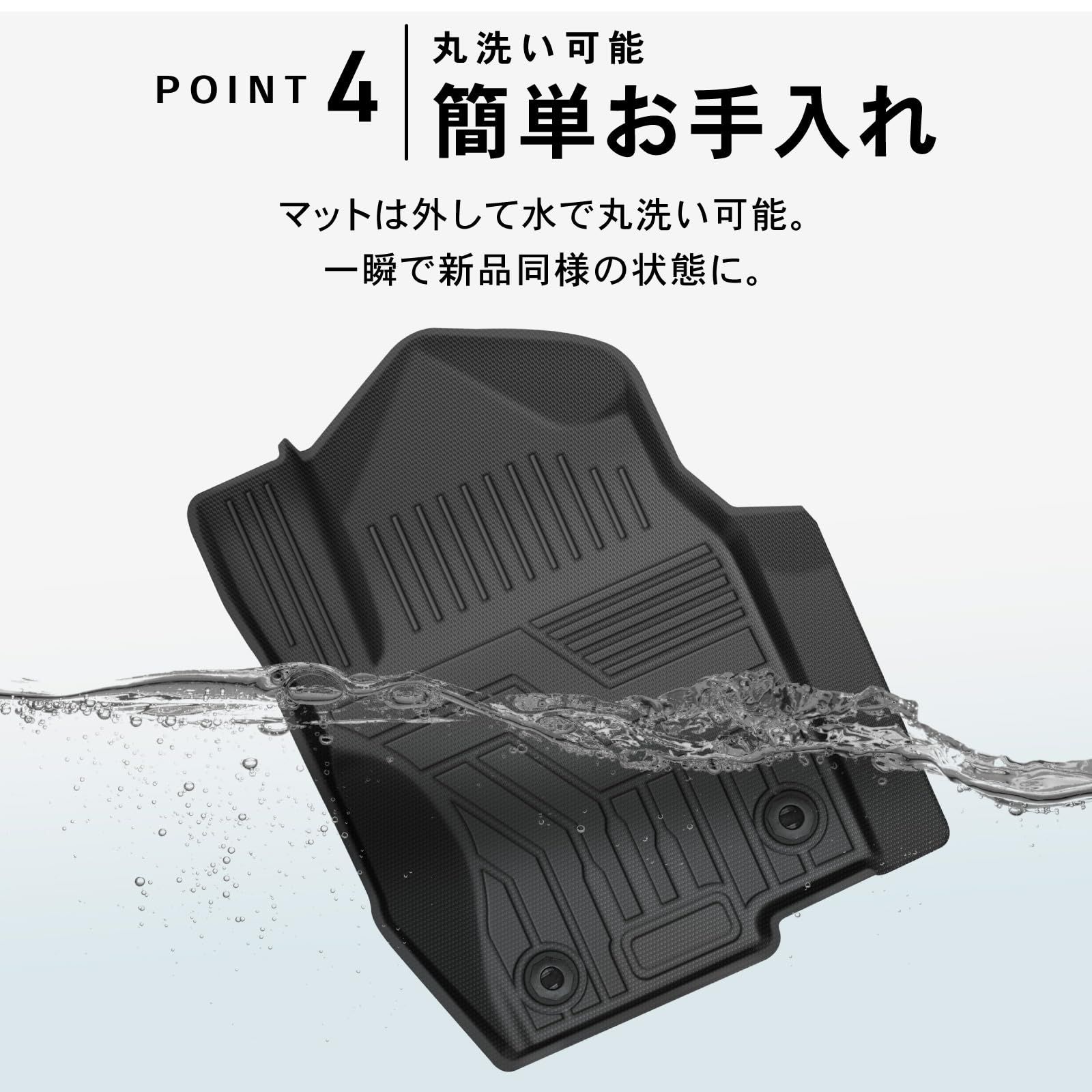 POINT.1 「車種別専用設計」 ジャストフィットでずれない専用設計となっております。 商品開発担当が現車から何度も試作を施し作成されたため、置くだけでピッタリフィットします。 泥・ホコリ・液体から愛車を守ります。また工具も一切不要なので、商品到着後すぐに設置が可能です。・POINT.2 「防水・防汚・防臭」 マットが汚れたら水拭き、水洗いOKです。また耐候性に優れ、長時間使用しても表面劣化が起こりません。防水設計、衝撃と水気から保護し、耐水性と耐久性に優れた素材を使用し、取り外してお手入れも簡単です。